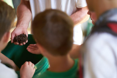 Most of the onlooking faces expressed an irrefutable “ew,” but beneath their prejudiced disgust was an underlayment of curiosity. Doug poured them into a volunteer’s cupped hands and, to his self-startling amusement, his scrunched face turned into a smile as the writhing throng of grubs rioted harmlessly in his palms. A smile spread across the group that bubbled into full-fledged laughter. Now others wanted to hold some too. He reached over the edge and cast the larvae evenly over the bottom of the bin. “Why do they try to crawl through my fingers?” he asked, still smiling. “They’re looking for someplace dark to go,” Doug said. “It’s just what they do.” Soon they were asking all kinds of questions: “How much can they eat? How long do they live? What do they do when they hatch?”