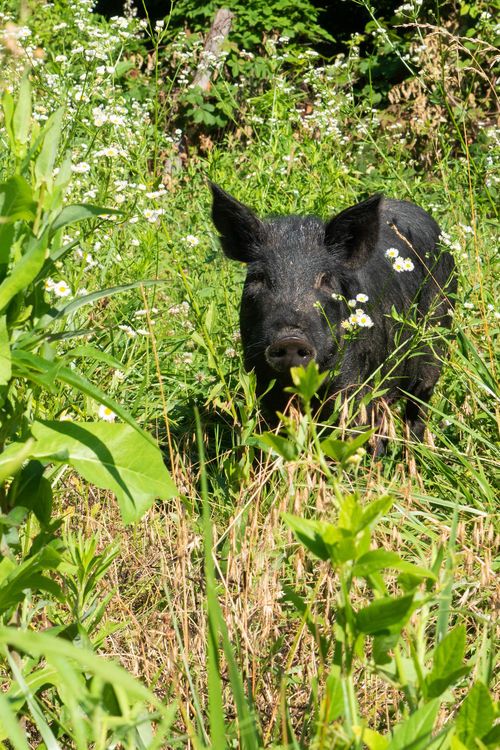 Ancestors of the American Guinea Hog were once the most popular breed of pig in the Southeast United States. Even Thomas Jefferson kept them! They are a rare breed in modern agriculture now, related to the extinct Improved Essex and Red Guinea hogs. Though we will be supplementing their diet with food waste from the dining hall, these pigs are great foragers and have been enjoying their pasture snacks. Both Wilma and Marvin have black coats, bristly hair, upright ears, and are about the size of a labrador dog, though stockier and with shorter legs.